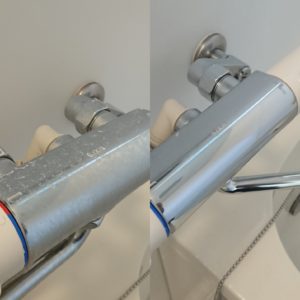 もちもん希釈、放置後 擦っていますが この薬剤を使うのと使わないのでは 水垢の硬さがかわり取れやすくなるのです!✨