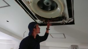 仲良くしてる業者さんに手伝ってもらっての 業務用エアコン洗浄!分解洗浄の予定でしたが、かなり古いエアコンで劣化などもあり、分解はせずに洗浄することに。