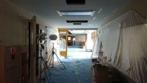 養生がめくれた箇所から清掃していく。